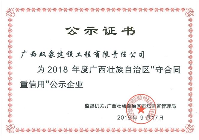 近日,經(jīng)自治區(qū)市場監(jiān)督管理局嚴格審查、考評,廣西北投交通養(yǎng)護科技集團工程有限責任公司憑借良好的社會信譽和企業(yè)實力,榮獲2018年度廣西“守合同重信用”榮譽稱號。