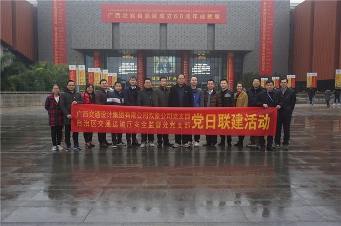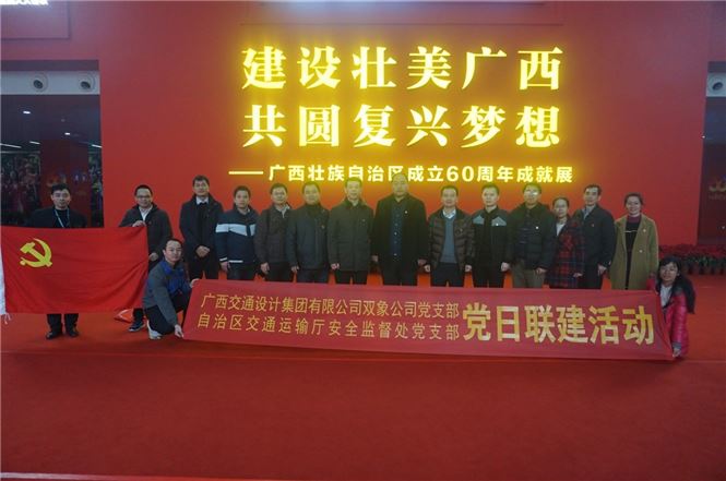 廣西規(guī)劃館氣象一新,盛裝以待迎接廣西壯族自治區(qū)成立60周年。2019年1月4日,細(xì)雨初歇,北投交通養(yǎng)護(hù)科技集團(tuán)黨支部沿著自治區(qū)成立60周年大慶活動的步伐,與自治區(qū)交通運(yùn)輸廳安全監(jiān)督處黨支部共同開展黨日聯(lián)建活動---組織前往廣西規(guī)劃館參觀《建設(shè)壯美廣西 共圓復(fù)興夢想——廣西壯族自治區(qū)成立60周年成就展》,了解自治區(qū)的發(fā)展歷程和各項事業(yè)取得的長足進(jìn)步。自治區(qū)交通安全監(jiān)督處調(diào)研員王永興、副處長姚鳳金,集團(tuán)公司總工程師林增海、北投交通養(yǎng)護(hù)科技集團(tuán)黨支部書記吳小流及兩支部的黨員參加了本次活動。